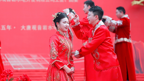 紅色彩帶、中式花燈、秀禾禮服……10月31日,大唐雲南發電有限公司“緣定大唐 幸福起航”第九屆“大唐良緣”青年職工集體婚禮在觀音岩水電站浪漫啟幕。11對身著傳統華裳的新人,以一場浸潤中華禮序之美的婚典,許下一生之約。