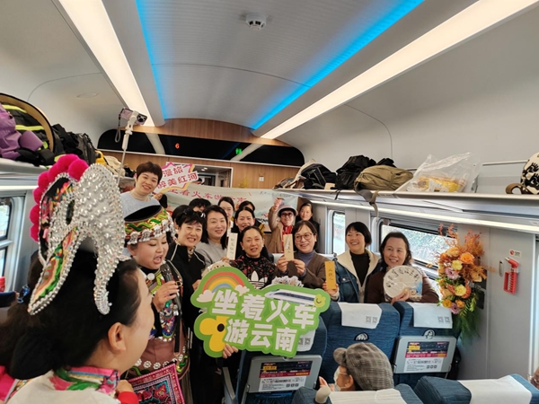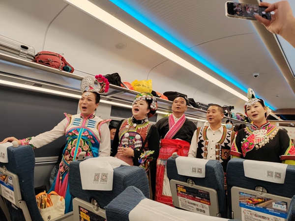 為給州慶之旅增添喜慶氛圍,國鐵昆明局聯合紅河州文旅部門在11月15日開行的C4222次列車上舉辦了特色文化活動。車廂內,建水民歌藝術家們獻上了《石榴開花紅彤彤》《請到建水來》等具有濃郁地方特色的小調聯唱。互動環節中,旅客們踴躍參與學唱建水小調、學説建水方言,獲勝者獲得了題有書法作品的折扇,車廂化身為感受紅河文化的流動課堂,歡聲笑語不斷。