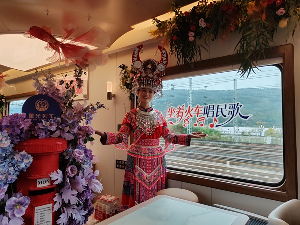 此次在列車上開展“坐著火車唱民歌”文旅主題推廣,是深化“鐵路+文旅+民歌”融合發展的新嘗試,國鐵昆明局經營開發部相關負責人介紹:“我們採用雲南民族特色元素對車廂進行裝飾,意在通過場景塑造和內容創新,豐富旅客乘車體驗,提升雲南民族文化內涵和影響力,推動‘雲南民歌大家唱’,助力文旅市場‘一路生花’。”