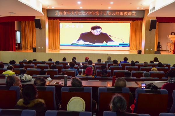 11月24日,雲南老年大學在報告廳舉行2025學年第十五期“雲嶺銀教課堂”,300余名學員收看學習貫徹黨的二十屆四中全會精神省委宣講團報告會。省委宣講團成員、雲南財經大學經濟學首席教授陳昆亭為離退休幹部和離退休幹部工作者作宣講報告。