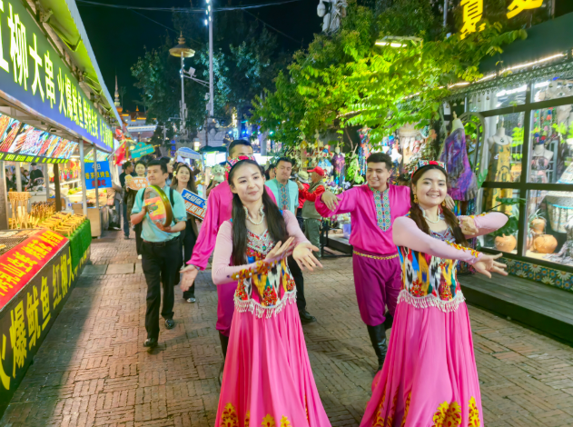 夜幕降臨,星光燒烤街的煙火氣與阿克蘇歌舞的熱情完美契合。演員們手持手鼓,邊唱邊跳、穿行街區,鮮艷的民族服飾在燈光下格外亮眼,成為一道流動的風景線。“新疆是我一直嚮往的地方!”來自江蘇的遊客邊強一邊品嘗阿克蘇紅棗一邊説,“今天不僅欣賞到了原汁原味的新疆歌舞,還吃到了甜滋滋的紅棗,明年一定要去阿克蘇看看!”