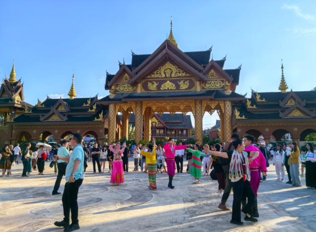 午後,傣族園潑水廣場熱度攀升。阿克蘇特色舞蹈與靈動的傣族舞在這裡相遇、交流、交融,引來陣陣歡呼。來自安徽的李衛民忍不住加入跳舞隊伍,邊跳邊分享道:“我去過阿克蘇,阿克蘇的大峽谷、成片的胡楊林美得讓人震撼,今天這場表演又勾起了我的回憶,真想再去阿克蘇!”