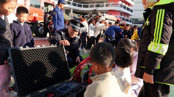 活動現場,大家圍在消防車旁仔細觀察車身構造、消防裝備和救生器材。消防救援人員耐心細緻地講解每一件裝備的名稱、功能和使用場景,讓同學們對消防工作有了更直觀、深刻地了解。