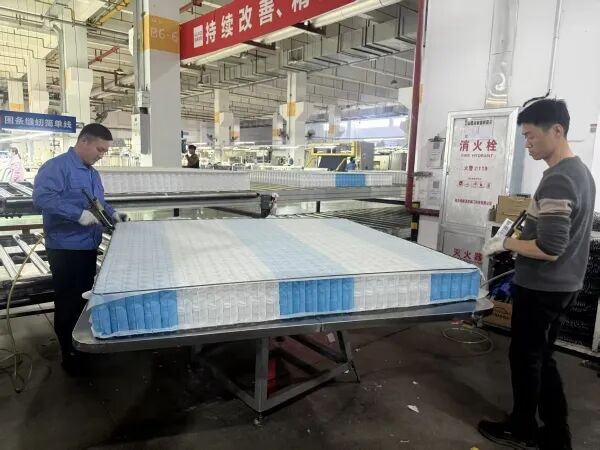 阿布都艾再孜•買吐送和組長檢查床墊生産品質。