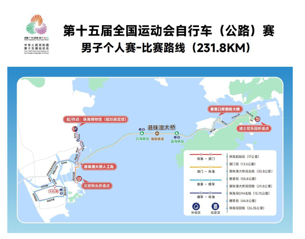 據介紹,本次公路自行車男子個人賽賽程231.8公里,從珠海博物館出發,經港珠澳大橋進入澳門,再由大橋前往香港,途經香港迪士尼樂園後返回,經港珠澳大橋到橫琴,最後回到珠海情侶路。比賽將於上午9時發槍,全程約5個多小時,將有23個代表隊及兩名個人運動員,共104名運動員參賽。