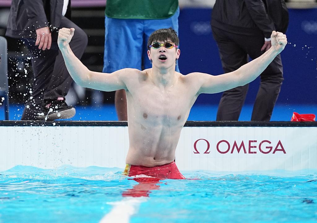 2024年7月31日,中國選手潘展樂在比賽後慶祝。當日,在巴黎奧運會游泳項目男子100米自由泳決賽中,中國選手潘展樂以46秒40的成績奪冠並打破世界紀錄。新華社記者 杜宇 攝