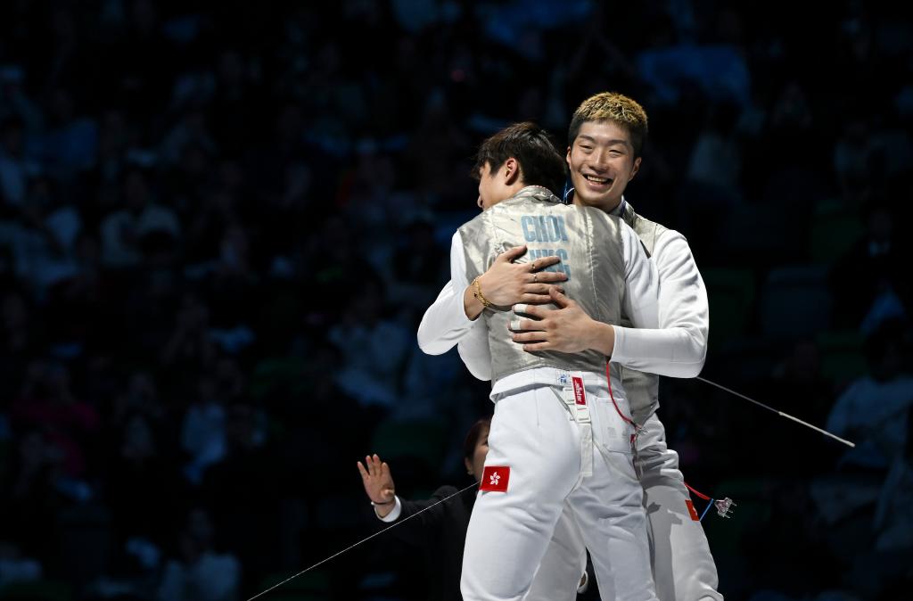 11月19日,香港隊選手張家朗(右)和隊友蔡俊彥在比賽後相擁慶祝奪冠。新華社記者 胡虎虎 攝