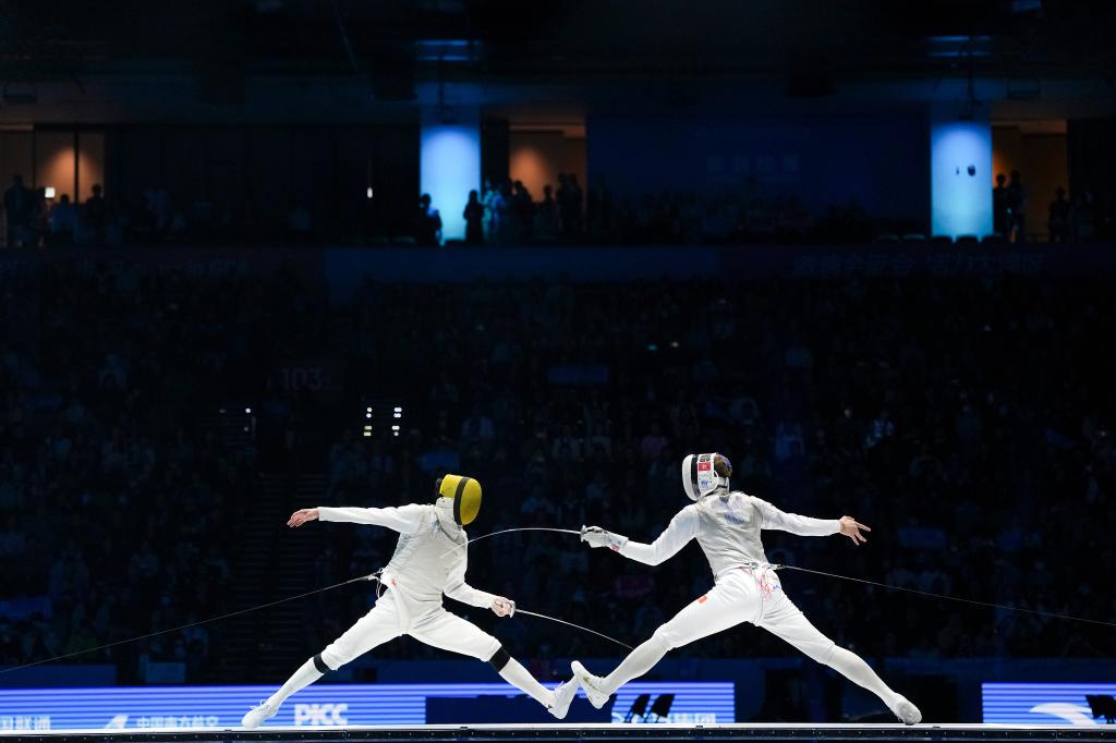 11月19日,香港隊選手張家朗(右)和福建隊選手陳海威在比賽中。新華社記者 吳魯 攝