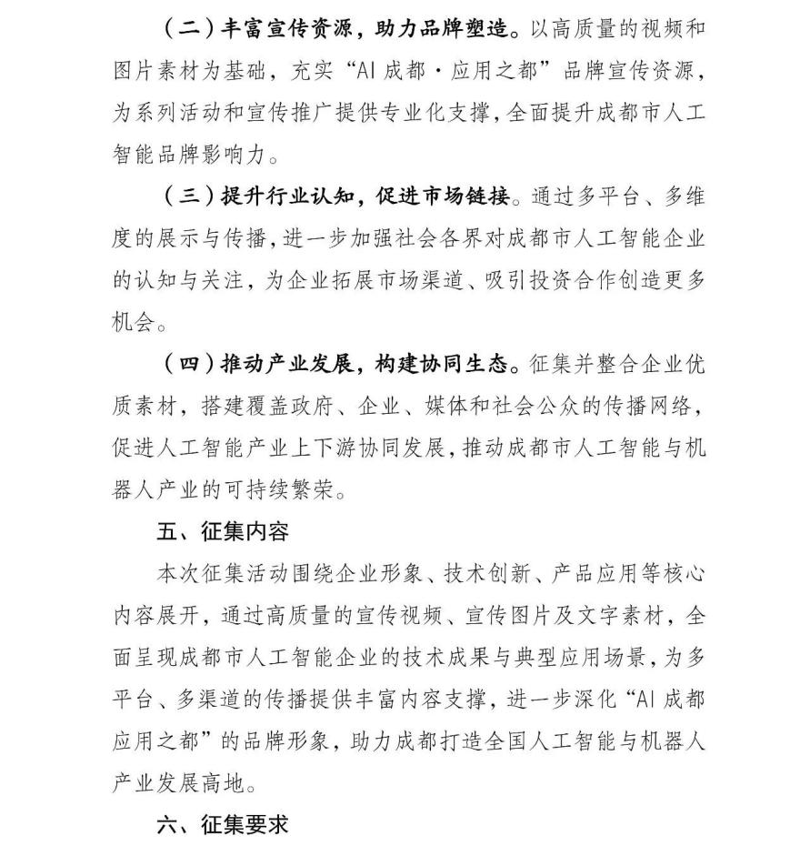 1月20日,由成都市經信局市新經濟委指導,成都市人工智慧産業生態聯盟主辦、成都市人工智慧産業協會協辦、四川中網文化傳播有限公司承辦、中國網支援的首屆“AI成都·應用之都——講好成都市人工智慧故事創意視頻徵集展播活動”即將盛大啟幕!誠邀成都人工智慧企業積極參與,共同講述“Al成都·應用之都”的精彩故事!