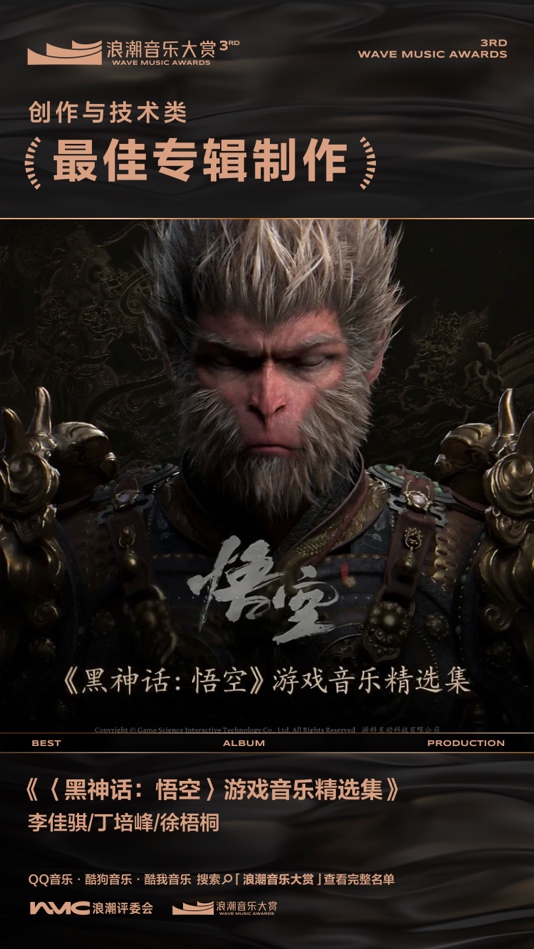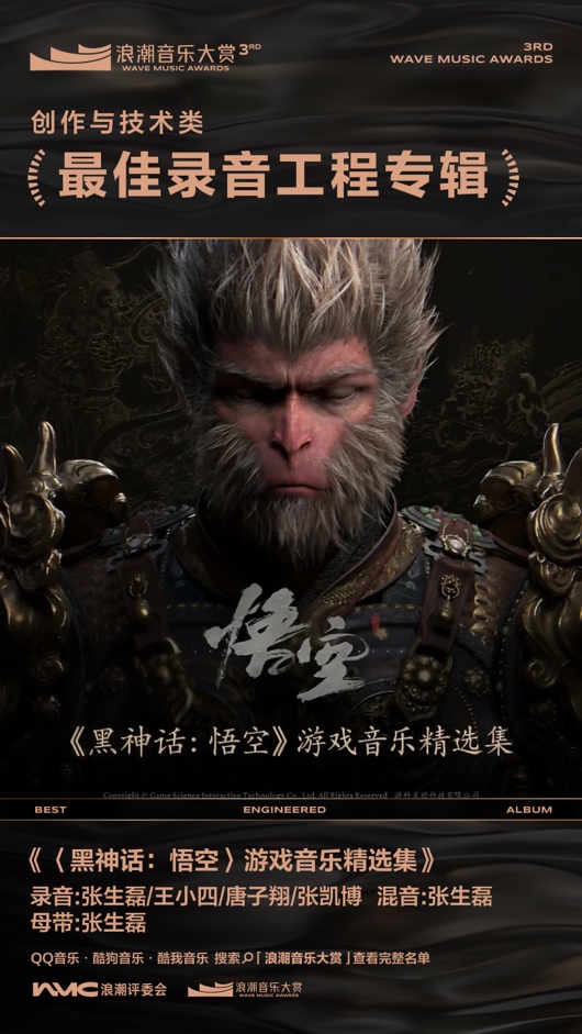 此外,《黑神話:悟空》遊戲音樂精選集,作為遊戲的衍生音樂作品,憑藉其精良的錄音品質與製作水準,同時獲得了最佳錄音工程專輯與最佳專輯製作兩項創作與技術類榮譽。