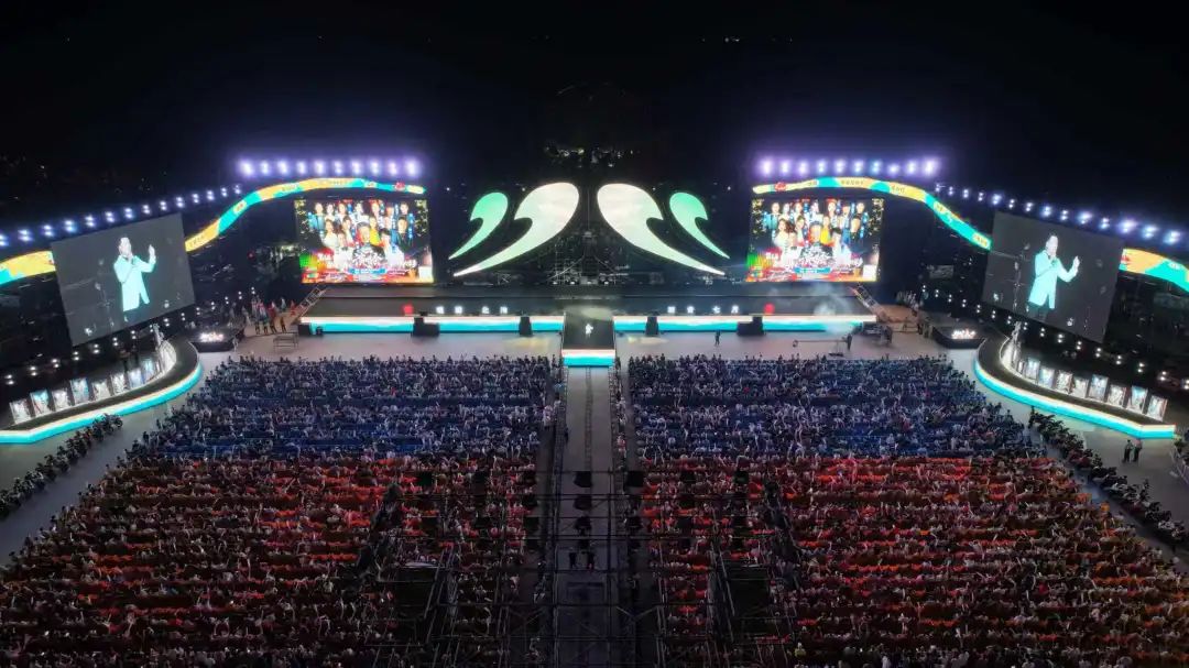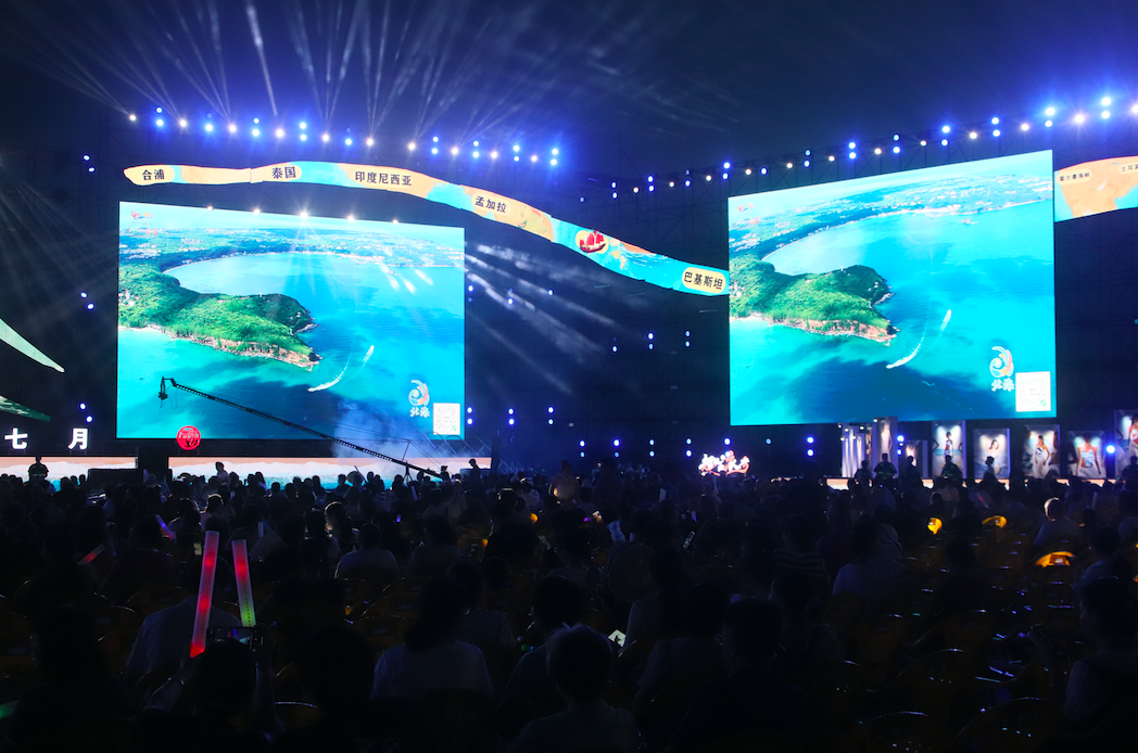 本次演唱會舞臺設計獨具匠心,以146米的恢弘氣勢鋪陳開來,兩側延伸出50米T臺深入觀眾席。設計靈感深深植根于北海的海洋文化基因:中心位置的“潮”雕化身璀璨明珠,前方的異形螢幕如翻涌的浪花,環繞裙邊的LED屏則生動展現著海上絲綢之路的壯闊畫卷,將深厚的向海文化與海洋魅力包裹整個現場。在模擬海浪與沙灘的自然布景中,模特們踏著T臺款款而行,時尚氣息與青春活力完美交融,點亮了北海“夜明珠”的浪漫氣質,完美呼應了順牌文化推動的“農文旅”融合中注重場景營造與沉浸式體驗的理念。