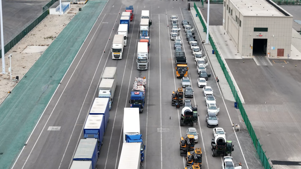 在霍爾果斯公路口岸,貨車、商品車、工程車等排成長龍,從中國駛向哈薩克。