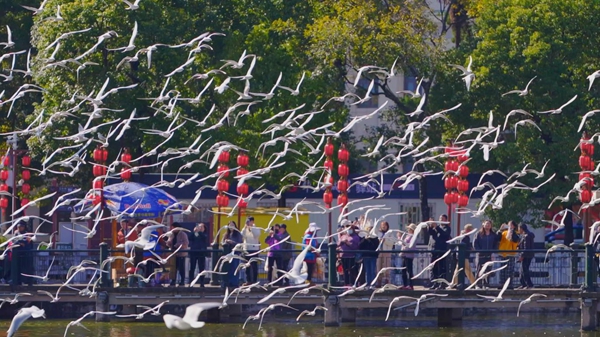 初冬的滇池之畔,白色精靈翩躚起舞。上萬隻紅嘴鷗舒展雙翼掠過水面,與手持鷗糧的市民遊客親昵互動,這幅延續四十年的靈動畫卷,正是昆明人與自然和諧共生的生動寫照。