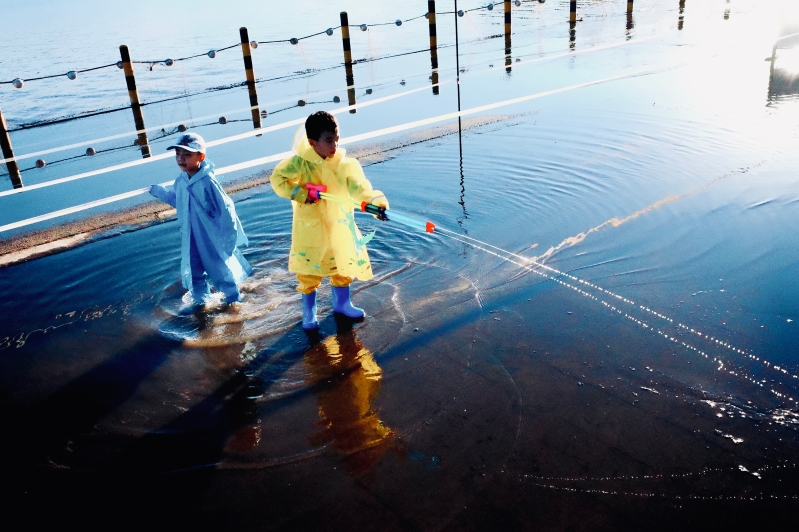 而在那積水的街道上嬉戲的孩子們,穿著雨衣雨靴,手持水槍,快樂地玩耍。這是童真的釋放,也是社會和諧安定的體現。孩子們是祖國的未來,他們能夠在這樣無憂無慮的環境中成長,得益於中國的和平與發展。