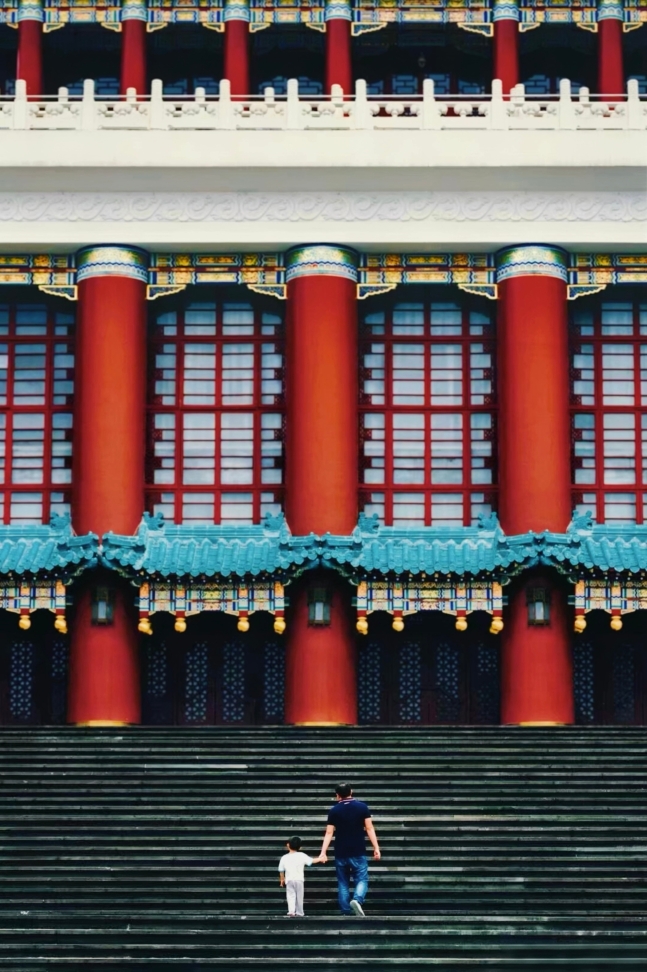 In the mountain city of Chongqing, there is a father and son walking hand in hand in front of the magnificent building. The red columns and cornices of the building highlight the charm of traditional Chinese architecture, and the backs of the father and son convey a kind of inheritance and hope. This is not only a warm moment of a family, but also tells the continuation and development of Chinese traditional culture between generations. Under the guidance of the older generation, the younger generation feels the heritage of national culture and moves towards a new journey.