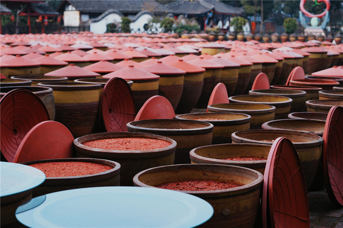 一桶大醬缸居中,大量的豆瓣醬缸在其後整齊擺放,體現了非遺的郫縣豆瓣醬釀造場面
