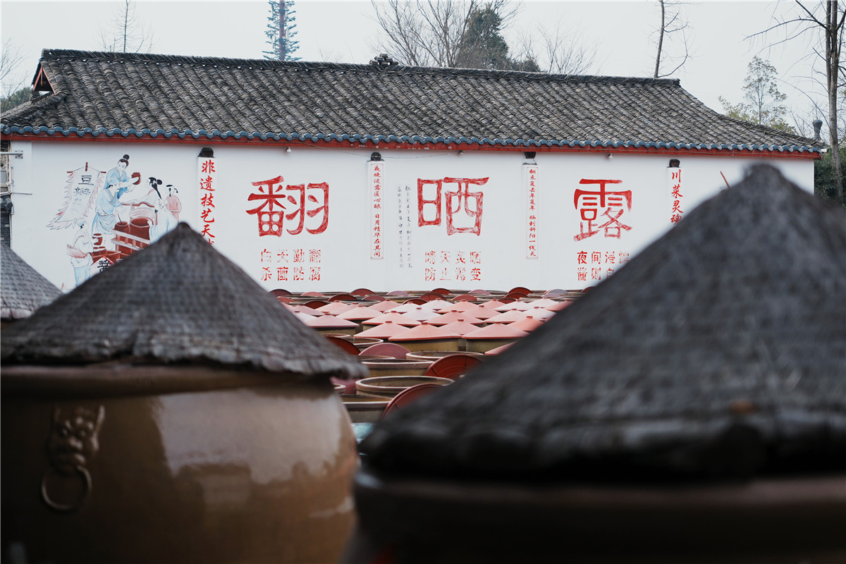 將大醬缸置於前景,後露出豆瓣醬缸,並突出白墻上的三個字,展現了豆瓣釀造的非遺工藝