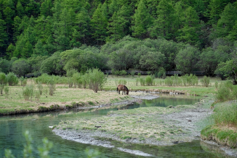 該作品定格稻城亞丁絕美風光,樹影倒映在寧靜湖面,馬兒悠然其間,構成一幅和諧寧靜的自然畫卷。