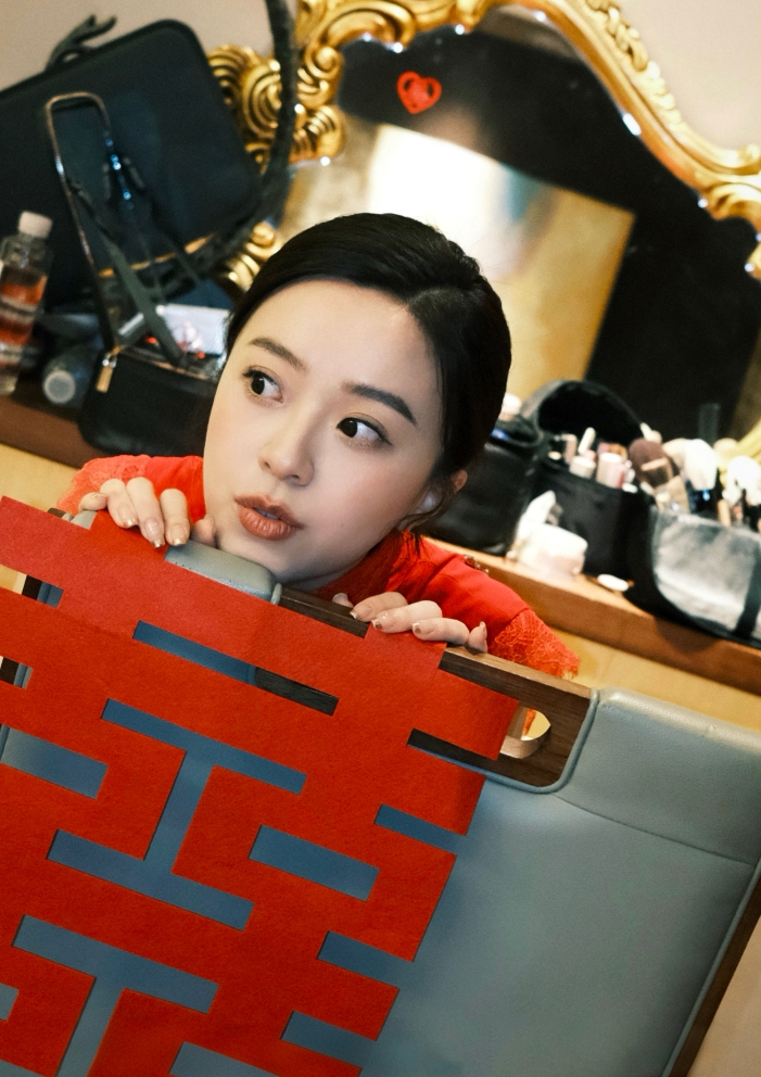 新娘在家化粧,透過玻璃窗,一個又一個重影的囍字,真幸福。