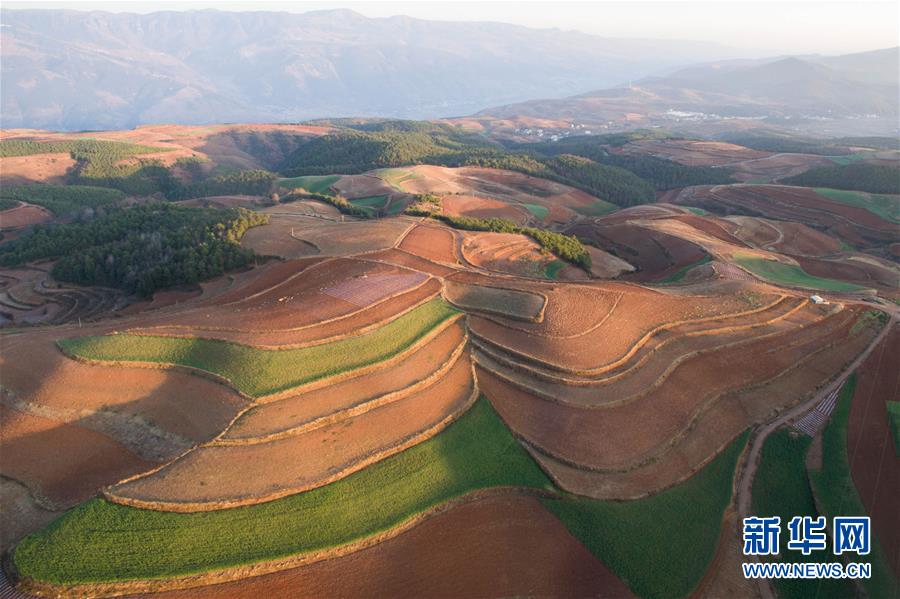 這是雲南東川紅土地一景(2月17日攝)。東川紅土地位於雲南省昆明市東川區西南40多公里的紅土地鎮,主要景點在海拔1800米至2600米之間,因獨特的地貌和氣候發育而成的紅色土壤而聞名。據了解,當地的土壤含鐵、鋁成分較多,有機質少,酸性強,土質黏重。這片氣勢磅薄、色彩斑斕的紅土地,在藍天、白雲和變幻莫測的光線下,形成了神奇壯美的景色。新華社記者胡超 攝
