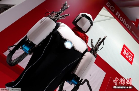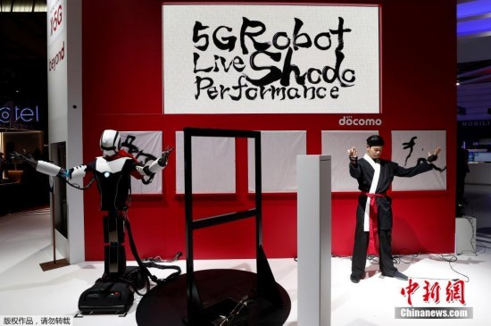當地時間2018年2月28日,西班牙巴塞羅那,“5G機器人”利用5G技術實現與操控者同步動作,完成書法寫作,並可以跟隨工作人員做相同的模倣動作。