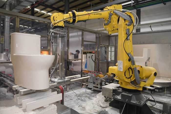 1月13日,智慧機器人在福建省首家5G智慧陶瓷工廠生産潔具。新華社記者 宋為偉 攝