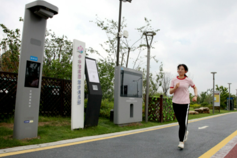 中華海棠園擁有一條全長5公里的閉環式智慧健身步道,沿途分別佈置2個AI智慧步道數據大屏和8個AI人臉、肢體識別桿,運用AI人臉識別技術,通過高速移動5G網路,能夠實時採集跑友的運動數據,特別便捷。
