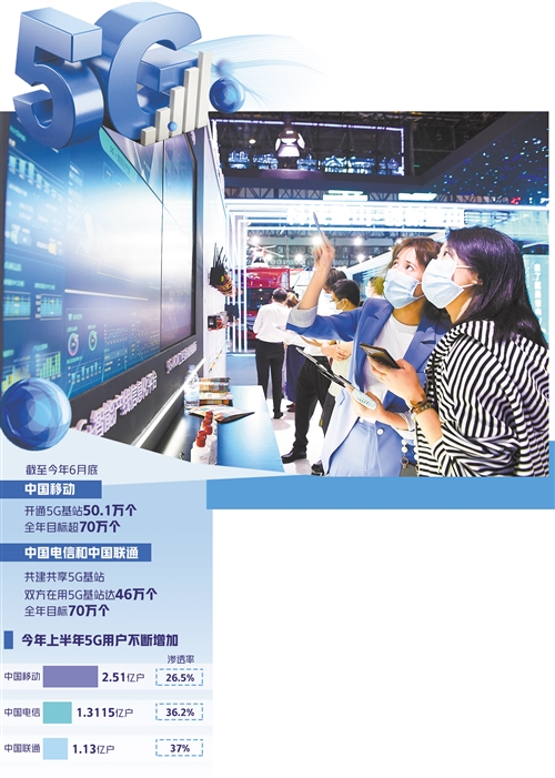 從5G基站看,截至今年6月底,中國移動已開通5G基站50.1萬個,全年目標超過70萬個;中國電信和中國聯通共建共用5G基站,目前雙方在用5G基站達46萬個,全年目標也是70萬個。工信部數據顯示,截至今年6月底,我國累計建設5G基站96.1萬個,覆蓋全國所有地級以上城市,5G手機終端連接數達3.65億戶,佔全球80%以上。