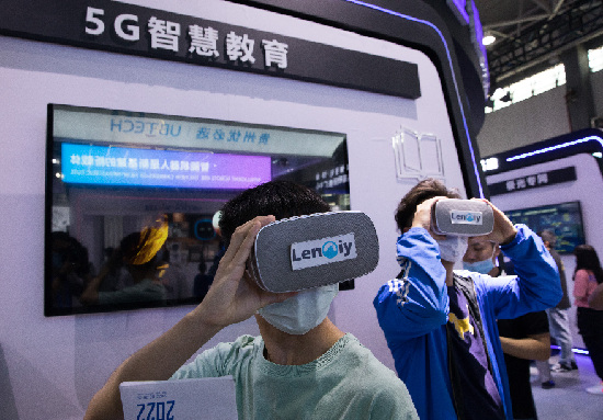 在2021中國國際大數據産業博覽會展館,觀眾在體驗5G智慧教育項目。