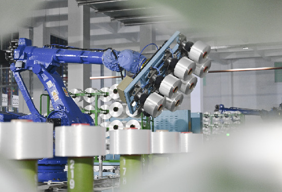 在福建省泉州晉江的百宏聚纖公司5G智慧化工廠,機械臂在滌綸工業絲流水線上作業。