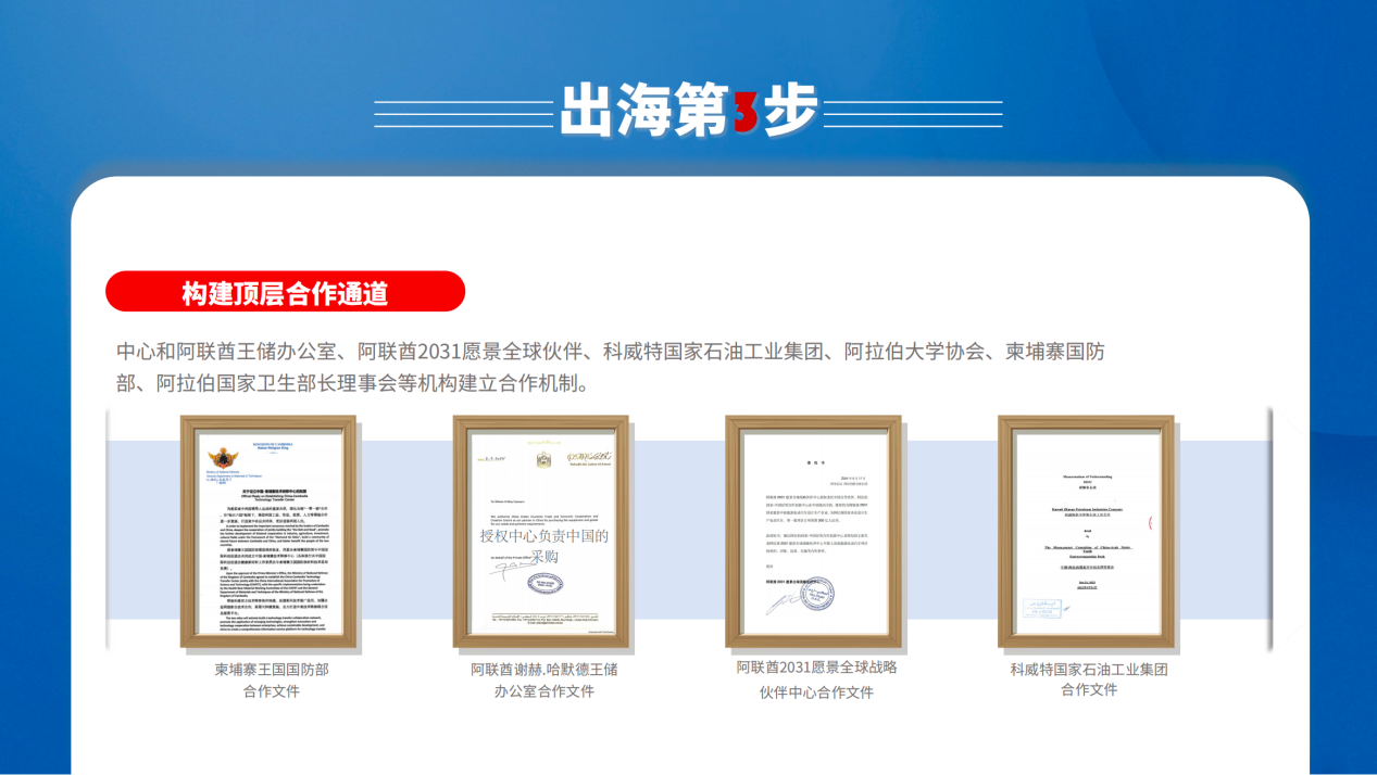 企業要積極利用國家和地方政府對“走出去”企業的政策支援,如稅收優惠、融資便利、海外市場開拓補助等,降低企業出海成本,提高成功率。針對海外市場的不確定性,需建立完善的風險防控機制,包括市場調研、風險評估、應急預案等,以應對可能出現的各種風險和挑戰。阿拉伯國家-中國經貿合作創新中心依託與海外政府部門的深度合作為企業出海構建了頂層合作通道,為企業出海全程保障。