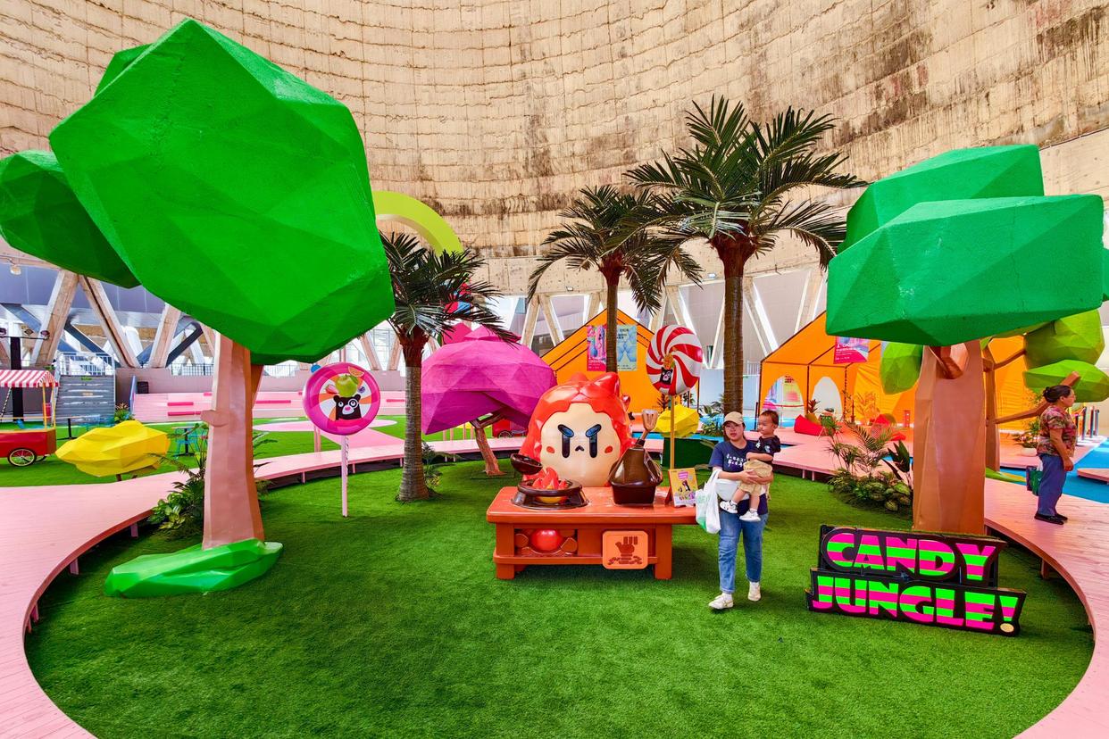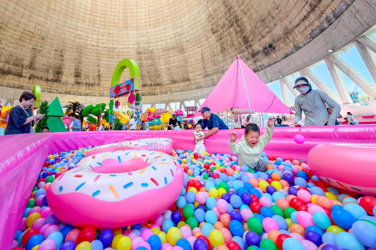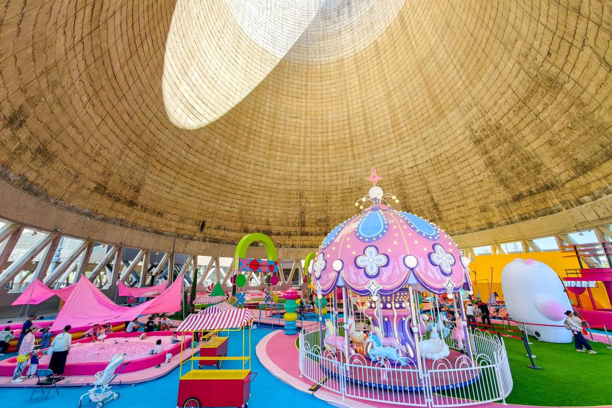 毗鄰大跳臺,大跳臺糖果露營地還原了《查理和巧克力工廠》的夢幻場景,草坪遊樂場、露營區、寵物友好區一應俱全,地標性打卡裝置“精神堡壘”已經落成。巨大的冷卻塔成為親子樂園,旋轉木馬、蹦床、海盜船等遊樂設施人氣兒爆棚,現場傳來孩子們的陣陣歡笑聲。